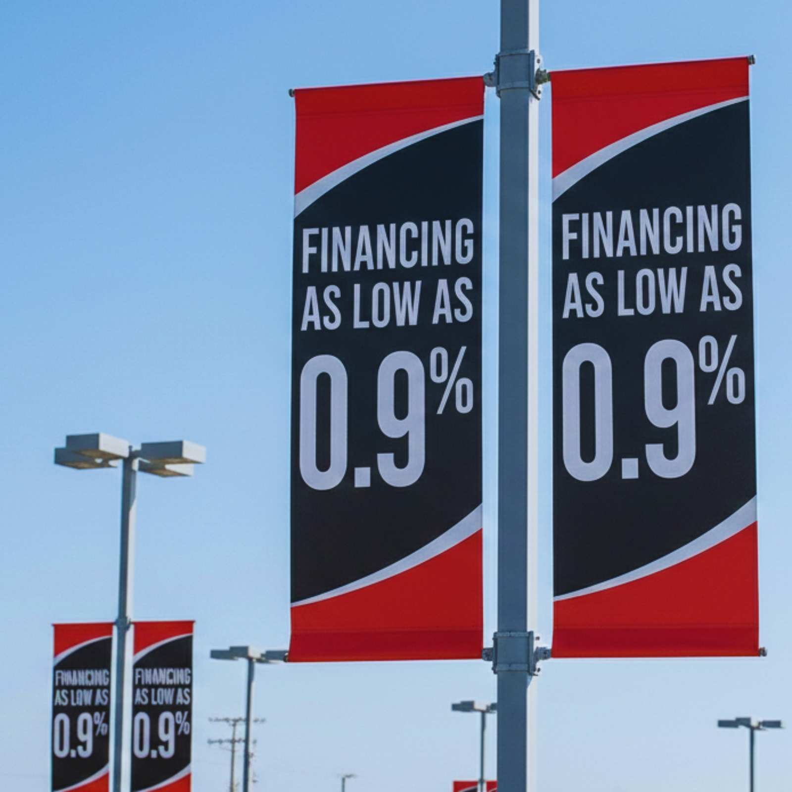 Street Pole Banners are common on car lots. But what's no so common is when they are used well. Green Valley Flags specialized in Street Pole Banner production for Auto lots and over the years, we have learned one thing: Less is more. We advise client to limit designs on their lot to one or two and to keep their colors simple and repetitive. We vary the messaging on the pole banners to maximize their impact and ensure that your lot gets noticed.