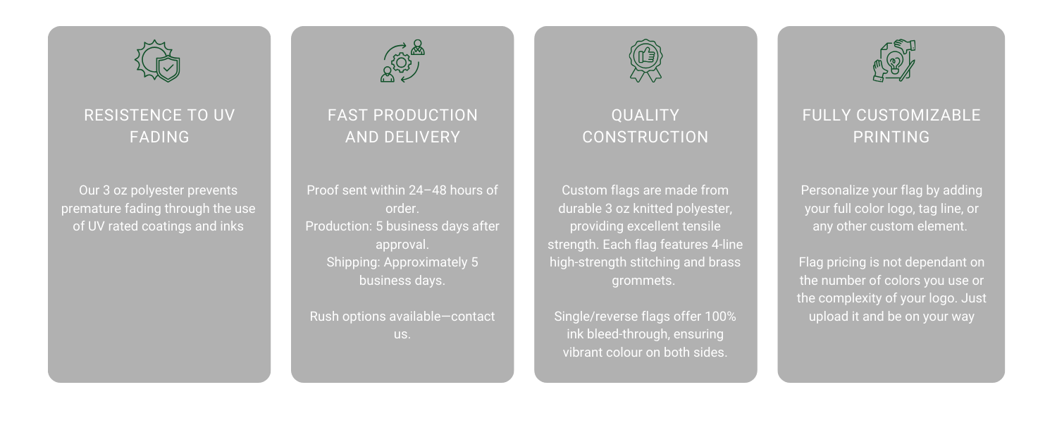 After ordering your Custom Flag, a proof is sent to you in 24-48 hours. Custom Flags are produced 5 days after proof approval with an additional approx 5 business days for shipping.