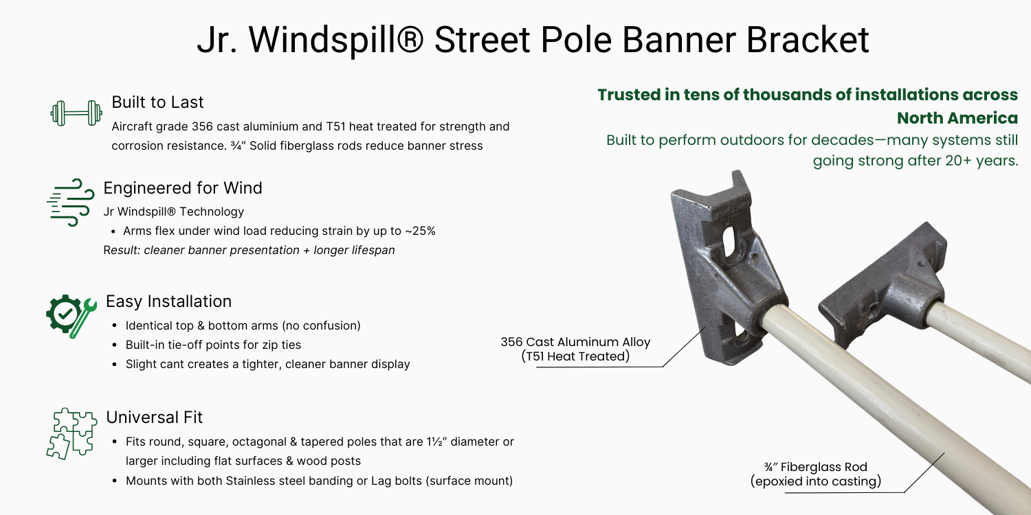 Engineered with flexible fiberglass arms and heavy-duty cast aluminum components, the Jr. Windspill® bracket reduces wind load while maintaining a clean, professional banner presentation. Its streamlined design makes it ideal for municipalities, automotive dealerships, campuses, and commercial streetscapes seeking dependable pole banner mounting hardware that’s easy to install and built to last.