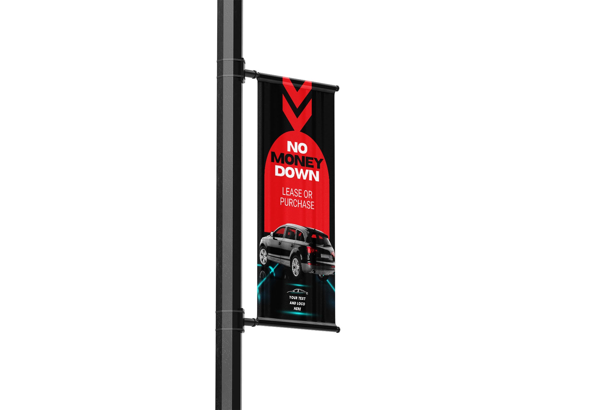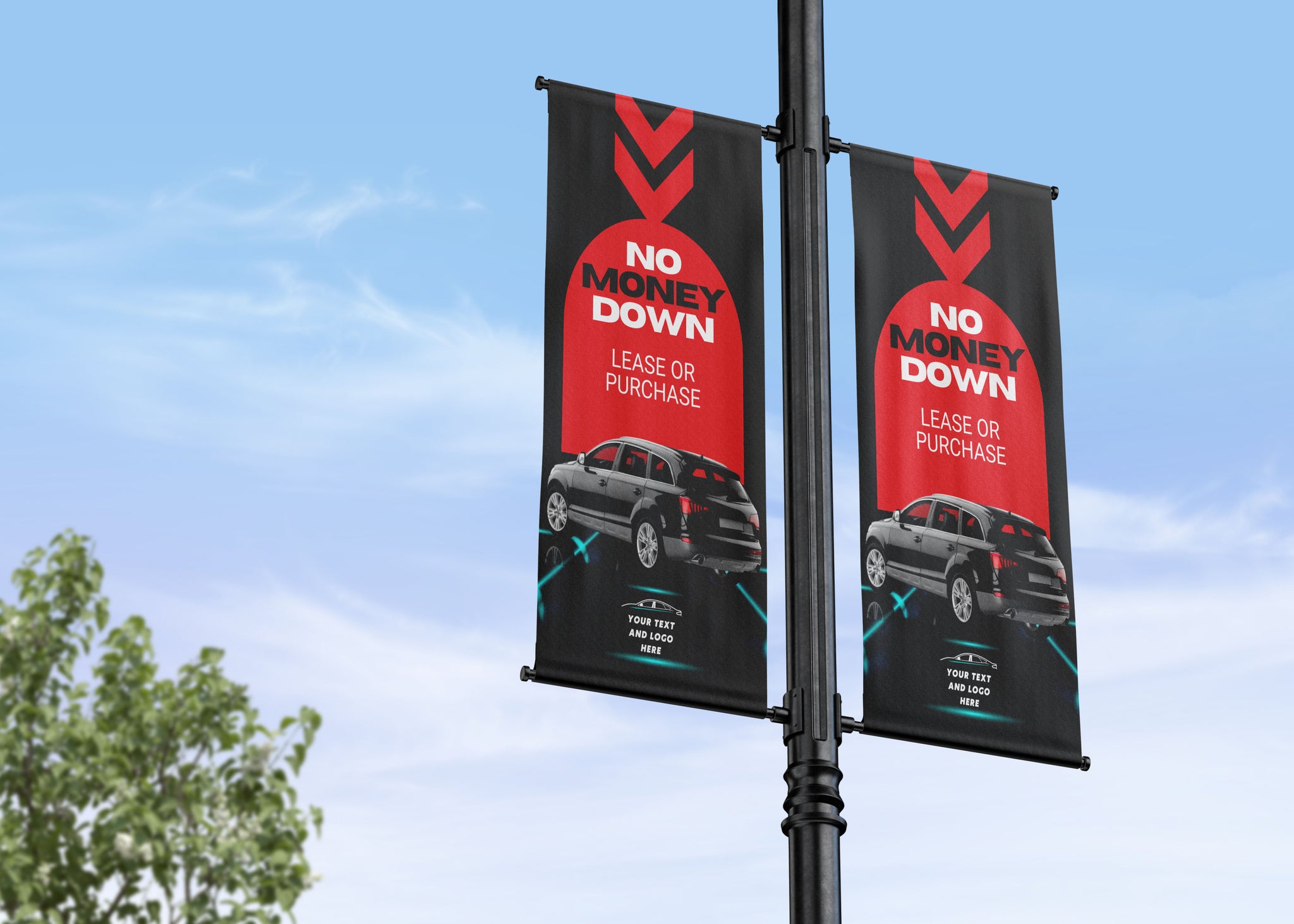 No Money Down street pole banners are a powerful way to promote auto options and highlight the value your dealership offers to customers. Whether you’re looking to add bold color to your car lot, increase street visibility, or attract drive-by traffic to your dealership, these vibrant lamp post banners are designed to get noticed.