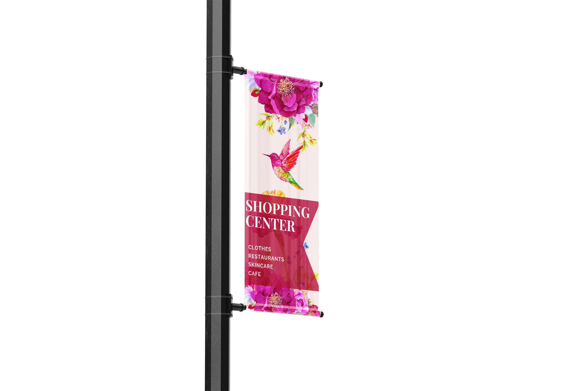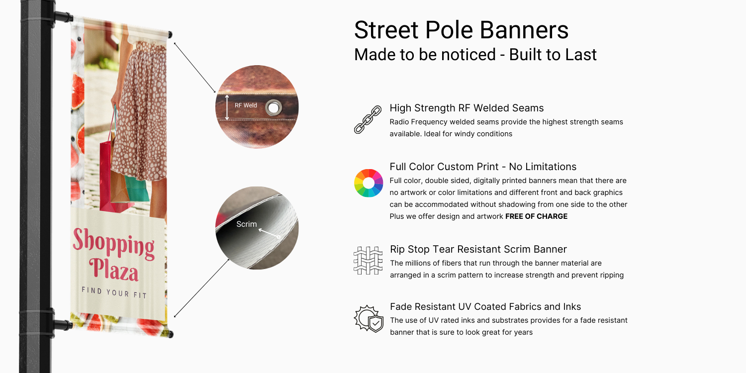 Refresh your shopping center's streetscape every season with custom lamp post banners that keep your property looking vibrant, current, and professionally branded year-round.